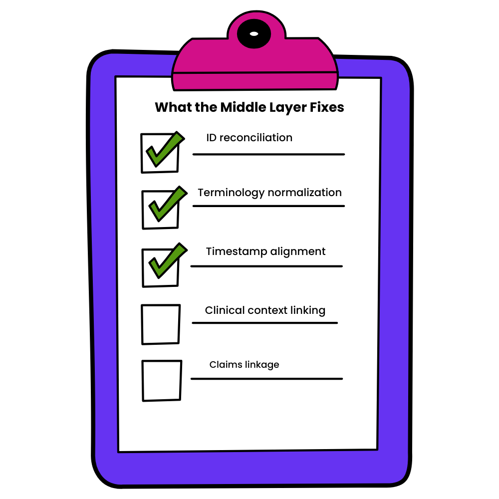 The middle layer aligns identifiers from the device cloud, EHR and billing system. It standardizes observation values into common formats. It resolves differences in naming across vendors. It also validates completeness of each record.