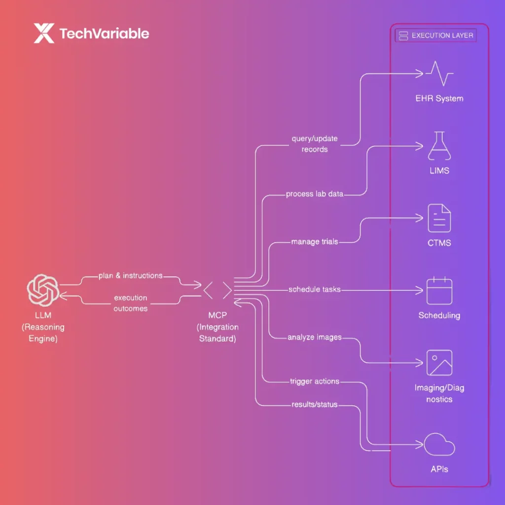 This is made possible through emerging standards such as the Model Context Protocol (MCP)—a framework that lets large language models (LLMs), APIs, and legacy software systems communicate seamlessly. Think of MCP as the healthcare industry’s “HTTP moment.” Once these standards are in place, AI systems can finally interconnect safely, enabling smarter, context-aware workflows across the entire healthcare data ecosystem.