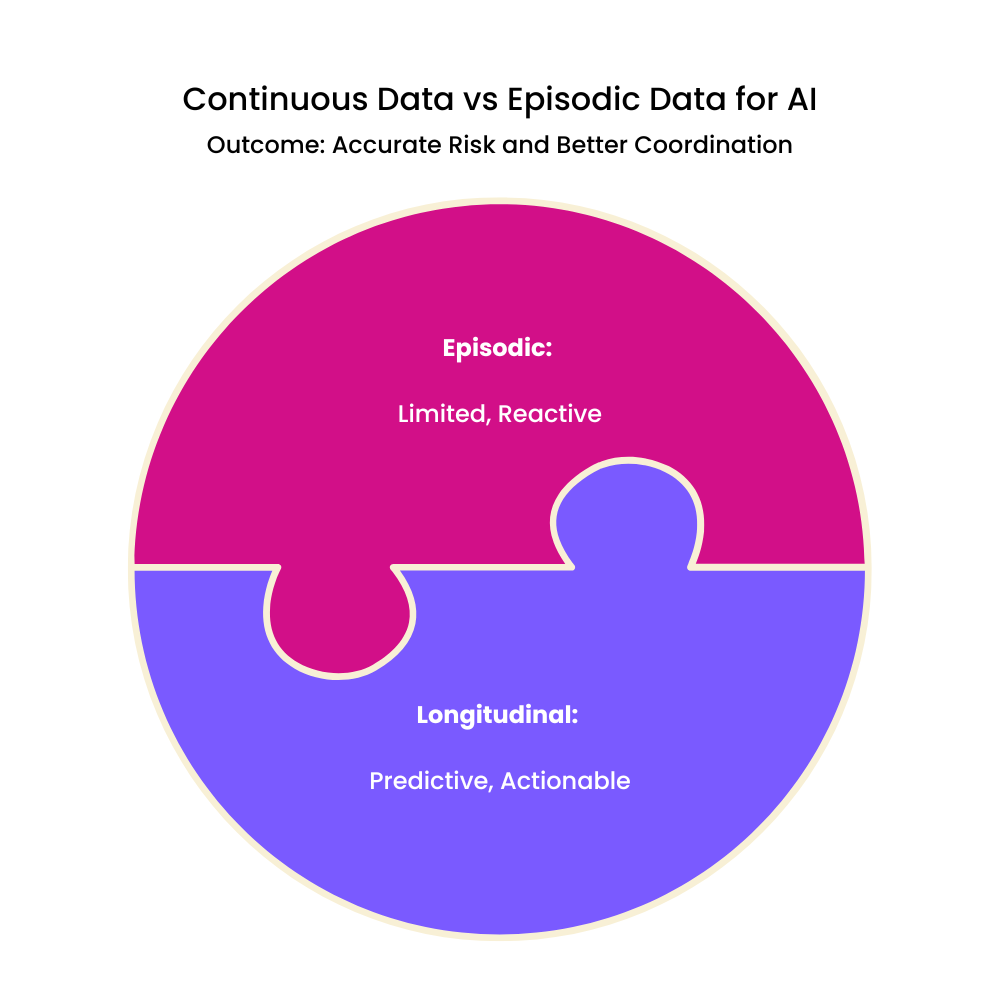 AI models work best when they can see the full sequence of events. Episodic encounters capture only a moment in time. They leave out behavior, adherence patterns, and reactions to therapy.